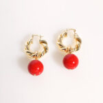 עגילי חישוק סופר שיק מלאי נוכחות! חישוקים מצופים זהב בסגנון צמה קלועה ותליון כדור זכוכית אדומה בגוון אש!