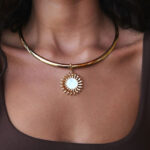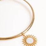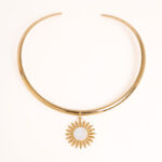 שרשרת סטטימנט מהממת קולר קשיח מוזהב בשילוב תליון שמש! ניתן גם להסיר את התליון ולענוד את הקולר במראה נקי. התליון שמש משובץ צדף לבן טבעי.