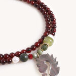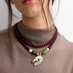 שרשרת שתי שכבות סופר מיוחדת בגוון בורדו וטקסטורת שיש שחור, תליון סוס עשוי צדף טבעי וחרוזים מיוחדים, מלאת נוכחות ונוטפת שיק!
