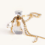 שרשרת עדינה אך מאוד מיוחדת , ארוכה עם תליון בקבוקון בושם עשוי אבן חן קוורץ טבעי שקופה.