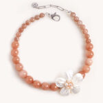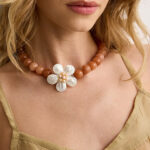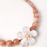 שרשרת שהיא וואו! יכולה להתאים לכלה שיקית או למישהי שאוהבת להעיז, אפילו עם גופיה וג’ינס או שמלת ערב, השרשרת עשויה אבני חן ג’ייד בגוון חום פודרה משגע ותליון פרח המשולב צדפים ופנינים מתוקות.